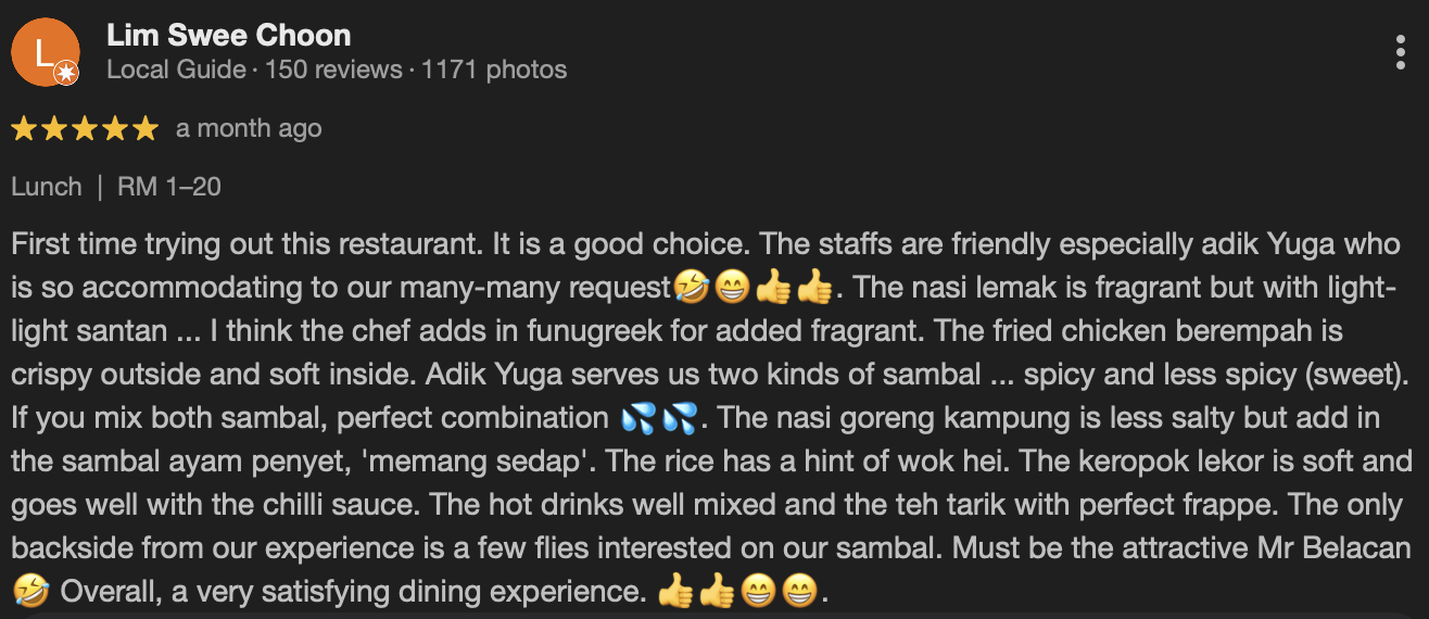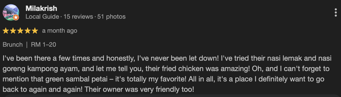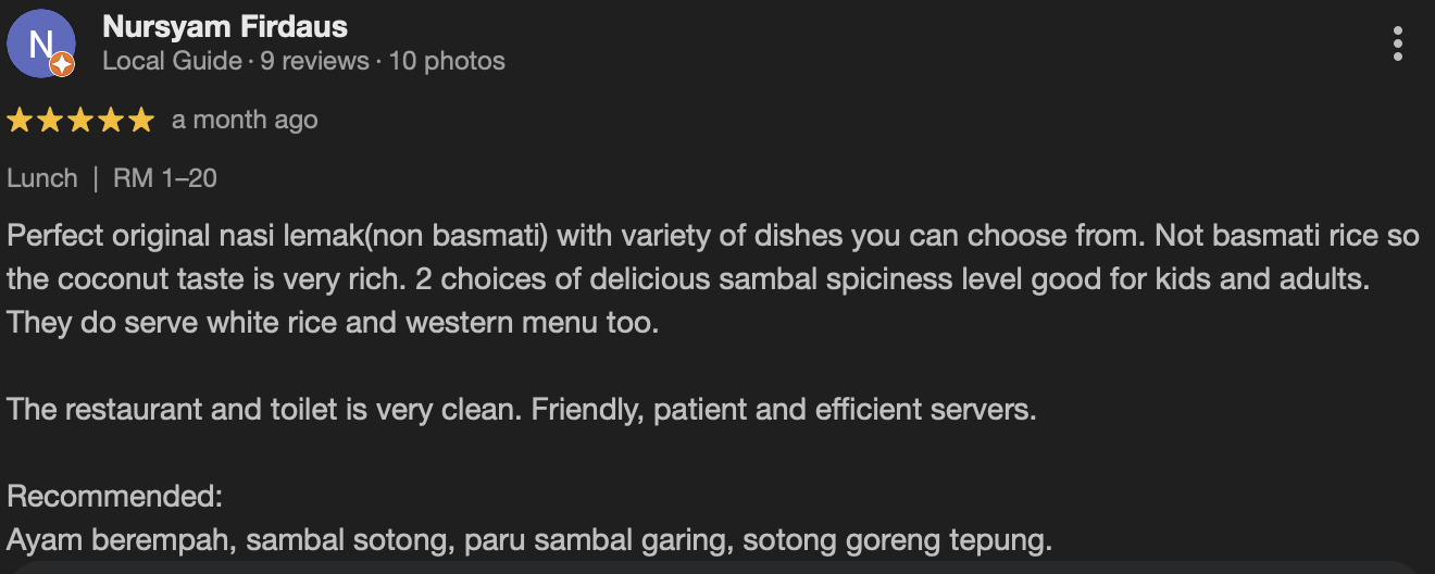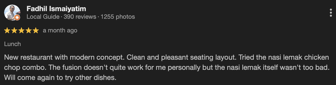 Menu paling popular ialah Nasi Lemak Ayam Goreng Berempah, digandingkan dengan nasi lemak santan segar, sambal pedas manis yang pekat serta ikan bilis rangup.