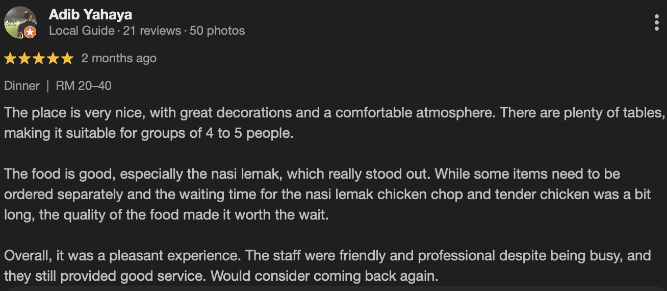 Restoran kami terletak di Bandar Seri Alam, Masai Johor dan dibuka setiap hari untuk pelanggan yang ingin menikmati hidangan nasi lemak tradisional.