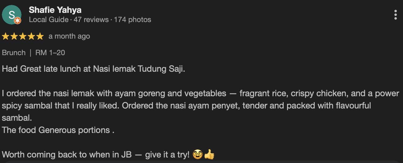 Jika anda mencari nasi lemak sedap di Bandar Seri Alam, Nasi Lemak Tudong Saji menawarkan nasi lemak dengan santan segar, sambal pedas manis yang dimasak perlahan serta lebih 20 pilihan lauk yang menyelerakan.