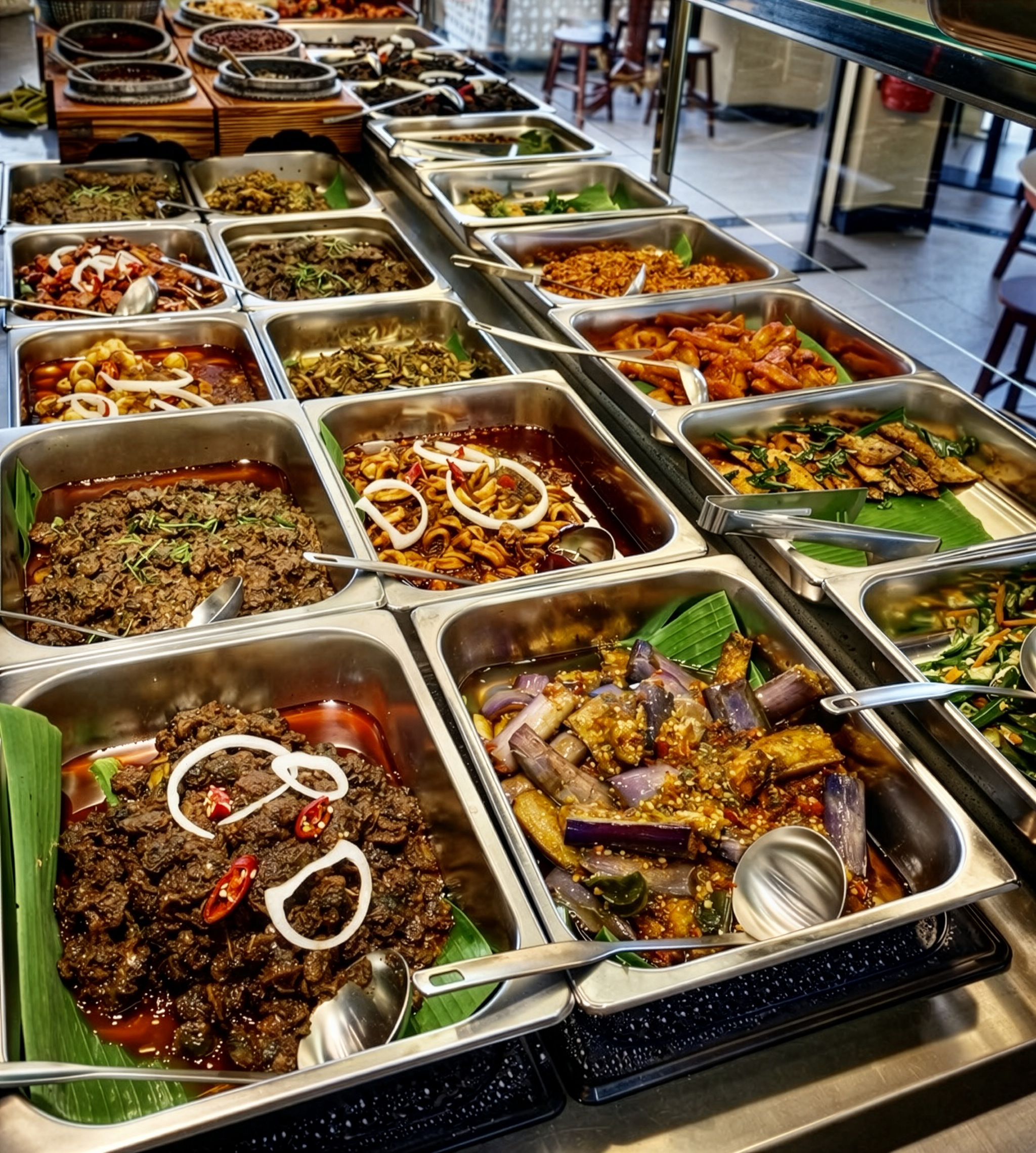 Di Nasi Lemak Tudong Saji, pelanggan boleh memilih daripada lebih 20 jenis lauk yang disediakan setiap hari untuk melengkapkan hidangan nasi lemak mereka.